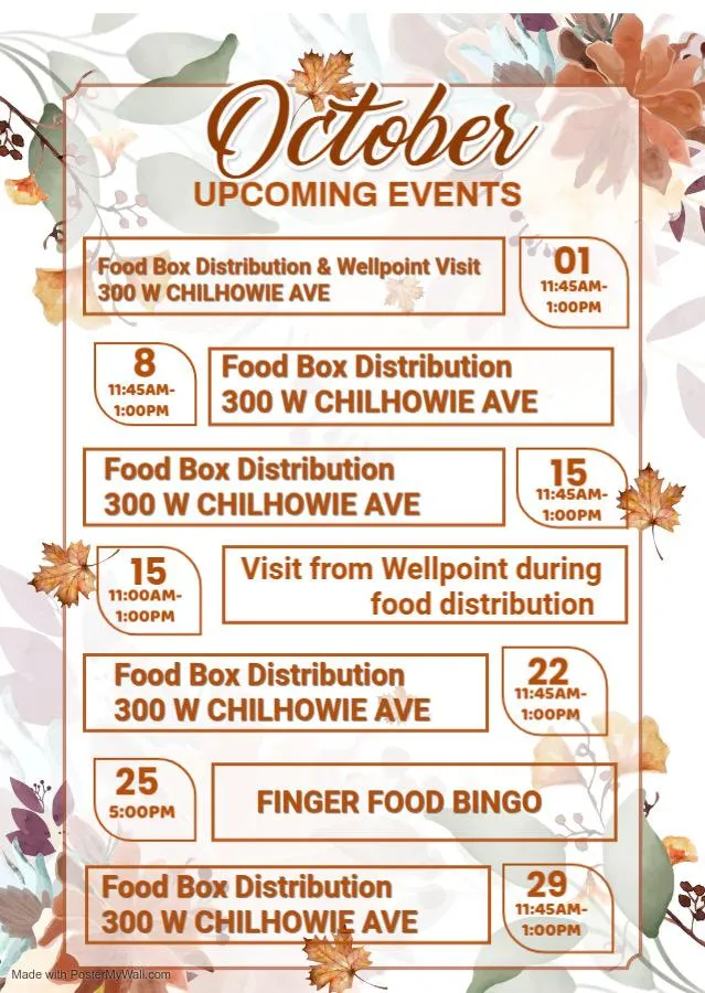 Join us throughout October at 300 W Chilhowie Ave for food box distributions, community support, and fun activities. Each week, we’re here to provide essential resources, friendly fellowship, and opportunities to connect with local partners like Wellpoint. Don’t miss our Finger Food Bingo night for a little extra joy and community spirit. Together, we’re making this season one of support, togetherness, and care.